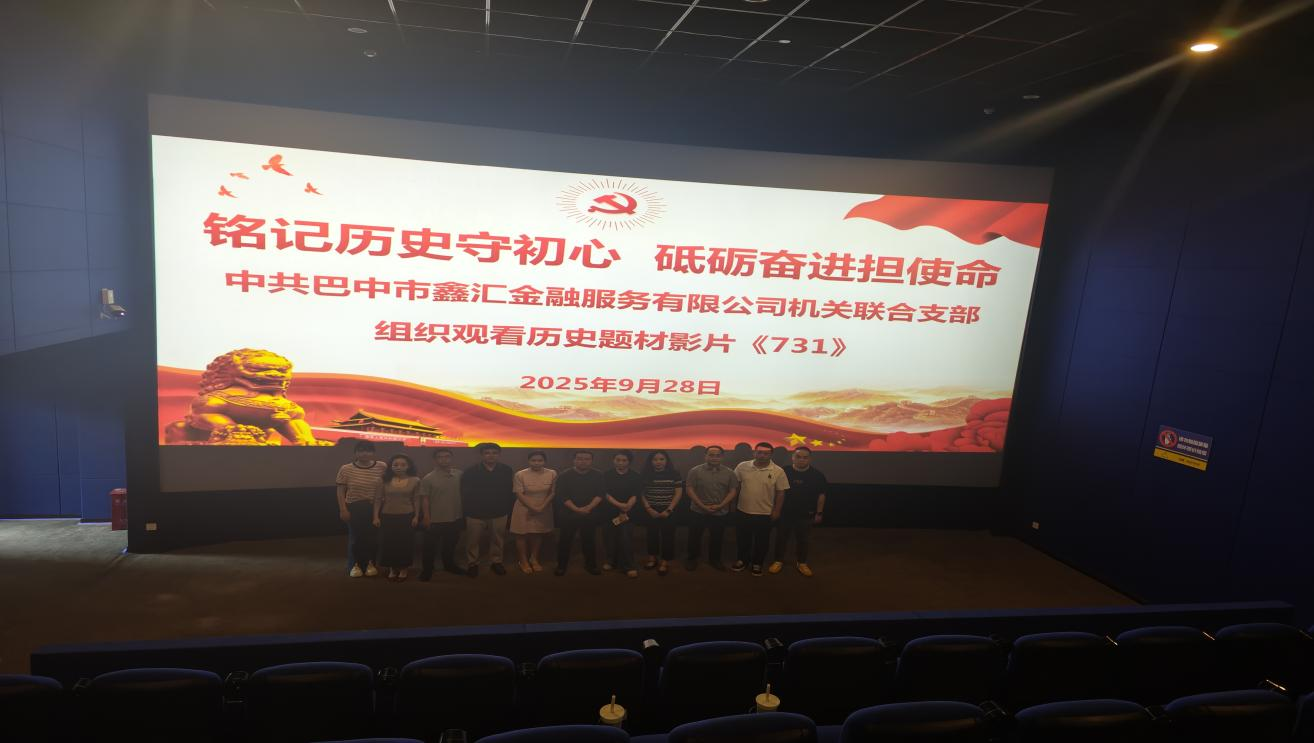 為深入推進(jìn)黨史學(xué)習(xí)教育常態(tài)化長效化,深刻緬懷革命先烈,弘揚(yáng)愛國主義精神,筑牢支部黨員理想信念根基,9月28日,中共巴中市鑫匯金融服務(wù)有限公司機(jī)關(guān)聯(lián)合支部組織全體黨員開展了以“銘記歷史守初心 砥礪奮進(jìn)擔(dān)使命”為主題的黨日活動(dòng),集中觀看了愛國主義教育題材電影《731》。